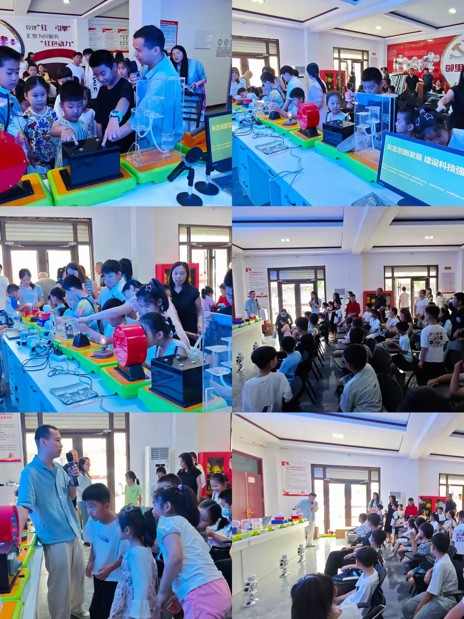 在室外,科普老师进行了“掌中火”等多场科普实验,并邀请孩子们互动参与,在亲自尝试中探索科学的奇妙。打扮成端午节“舞狮”的机器狗伴随着欢快节奏,摇摆身躯、伸展四肢,引得大家欢呼不断。室内布置了“太阳能发电”“磁悬浮灯泡”“窥视无穷”“纳米磁波”等多种科普展品,科普讲解员通过深入浅出的讲解,将原本晦涩难懂的科学知识,生动形象地介绍给孩子们。